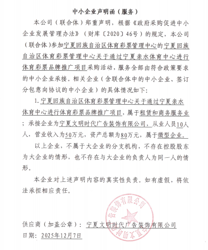 宁夏回族自治区体育彩票管理中心关于通过宁夏人民会堂宣传资源进行体育彩票品牌推广项目单一来源采购结果公告一、项目编号:NXJY-2025-055(C55)二、项目名称:宁夏回族自治区体育彩票管理中心关于通过宁夏人民会堂宣传资源进行体育彩票品牌推广项目三、中标(成交)信息供应商名称供应商地址供应商联系电话中标(成交)金额(元)宁夏回族自治区会务保障服务中心宁夏银川兴庆区文化西街111号13909576993383000.00四、主要标的信息标的名称服务范围服务要求服务时间服务标准宁夏回族自治区体育彩票管理中心关于通过宁夏人民会堂宣传资源进行体育彩票品牌推广项目符合采购文件要求满足采购文件要求自合同签订之日起12个月满足采购文件要求五、评审专家名单:奚之强(组长)、何贵然采购人代表:朱骞六、代理服务收费标准及金额5775元。收费标准:参考原国家计委计价格【2002】1980号文和国家发改委发改办价格【2003】857号文,由成交单位支付。七、公告期限(自本公告发布之日起1个工作日)八、其他补充事宜:无九、凡对本次公告内容提出询问,请按以下方式联系。1.采购人信息名称:宁夏回族自治区体育彩票管理中心地址:宁夏银川市金凤区亲水南大街35号联系方式:0951-56029852.采购代理机构信息名称:宁夏巨源项目管理有限公司地址:银川市金凤区紫荆花商务中心B座2303联系方式:0951-33015793.项目联系方式采购人项目联系人:孙磊电话:0951-5602985代理机构项目联系人:王晶、于则杨、陈玉娟、赵博、李丹阳电话:0951-3301579、17395021799宁夏巨源项目管理有限公司2025年12月9日