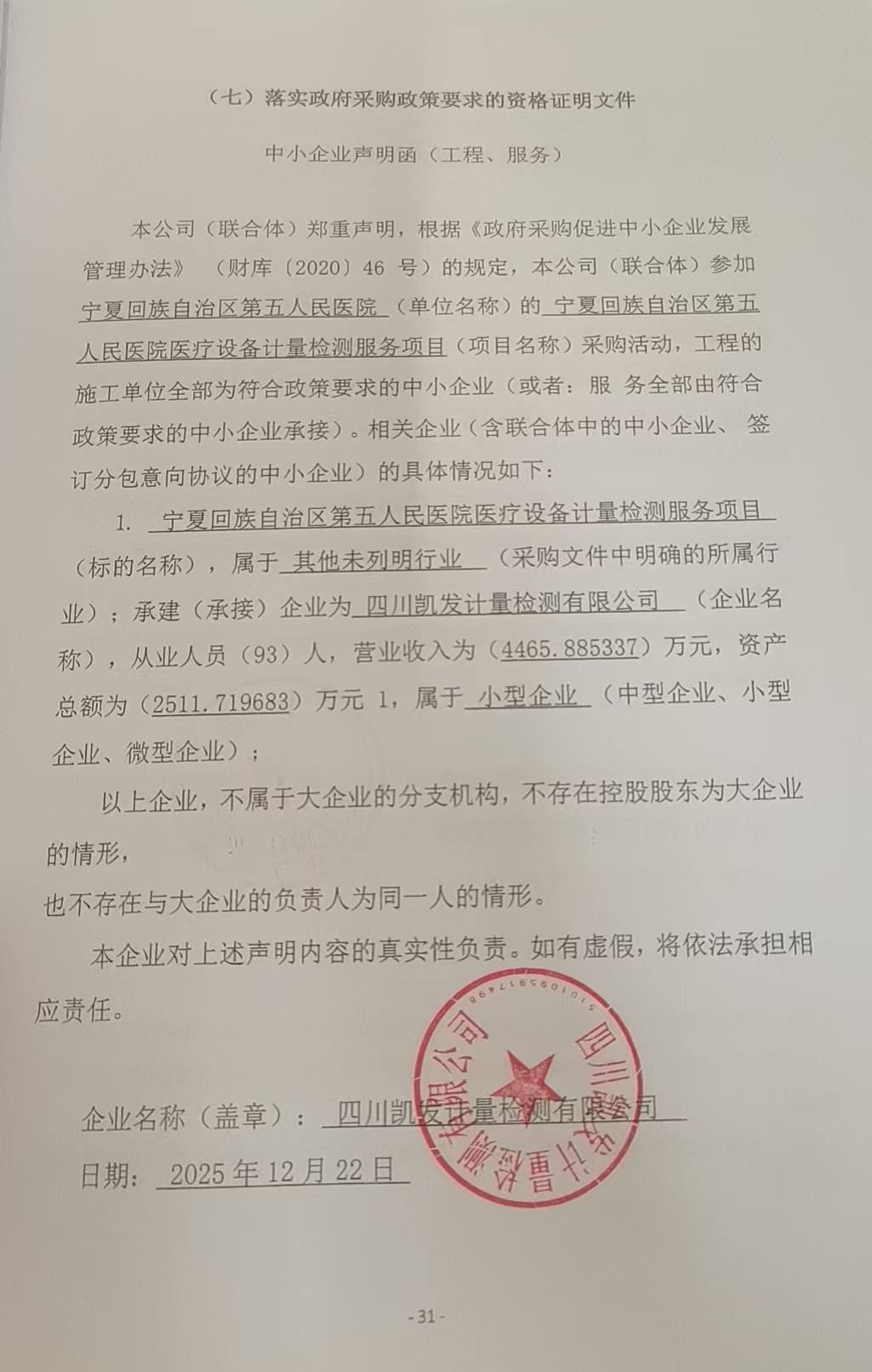窗体顶端宁夏回族自治区第五人民医院医疗设备计量检测服务项目中标公告一、项目编号:ZTSJ-NZC-S25090 (招标文件编号:ZTSJ-NZC-S25090 )二、项目名称:宁夏回族自治区第五人民医院医疗设备计量检测服务项目三、中标(成交)信息供应商名称:四川凯发计量检测有限公司供应商地址:四川省成都市成华区华盛路58号52幢中标(成交)金额:8.8折四、主要标的信息序号供应商名称服务名称服务范围服务要求服务时间服务标准1四川凯发计量检测有限公司医疗设备计量检测服务具体内容详见采购文件具体内容详见采购文件两年具体内容详见采购文件五、评审专家名单:谢庆平、耿敏、姜梅英、窦立成、万宁。六、代理服务收费标准及金额:本项目代理费收费标准:按照宁夏招投标协会宁招协发【2023】31 号《关于招标代理行业服务收费的指导意见(试行)》文件收费标准收取,由中标单位一次性支付招标代理服务费。本项目代理费总金额:1.2000000 万元(人民币)七、公告期限自本公告发布之日起1个工作日。八、其它补充事宜无九、凡对本次公告内容提出询问,请按以下方式联系。1.采购人信息名称:宁夏回族自治区第五人民医院地址:宁夏回族自治区石嘴山市大武口区朝阳西街168号联系方式:0952-38171582、采购代理机构信息名称:中天世纪国际招标有限公司地址:银川市金凤区新昌西路金钻名座财富中心13层石嘴山分公司地址:石嘴山市大武口区永康南路493号联系方式:130079640863、项目联系方式采购项目联系人:张芳钰电话: 0952-3817158代理机构联系人:张强电话: 13007964086中天世纪国际招标有限公司2025-12-22