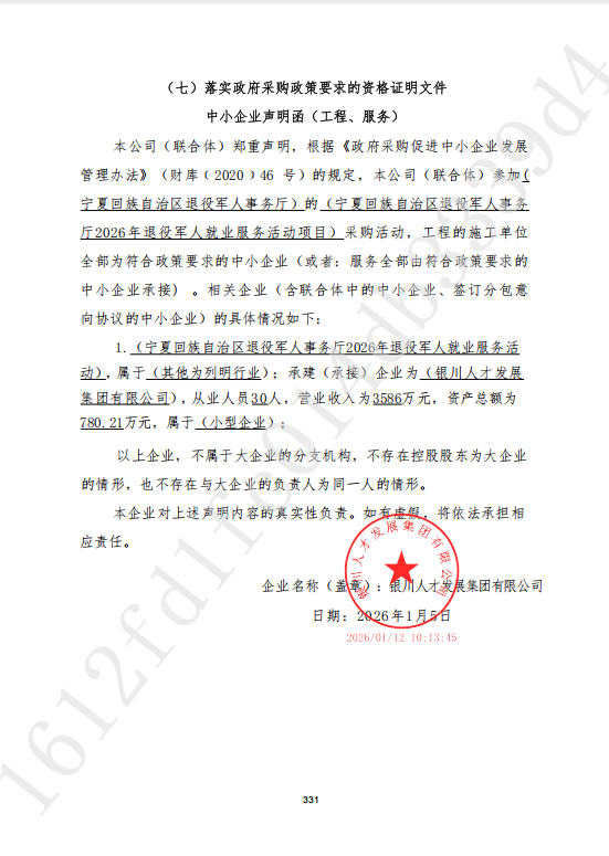 宁夏回族自治区退役军人事务厅2026年退役军人就业服务活动项目成交公告一、项目编号:ZTSJ-NZC-A25428二、项目名称:宁夏回族自治区退役军人事务厅2026年退役军人就业服务活动项目三、中标(成交)信息供应商名称供应商地址供应商联系电话中标(成交)金额(元)银川人才发展集团有限公司宁夏银川市金凤区宁安巷人才大厦十三层0951-7888808345000.00四、主要标的信息服务类标的名称服务范围服务要求服务时间服务标准宁夏回族自治区退役军人事务厅2026年退役军人就业服务活动项目详见磋商文件详见磋商文件2026年1月至10月满足磋商文件要求五、评审专家名单:乔礼平(组长) 周峰采购人代表:任荣峰六、 代理服务收费标准及金额:5250.00元,收费标准:预算金额100万元以下按1.5%计取,由成交人支付。七、公告期限(自本公告发布之日起1个工作日):2026年1月13日八、其他补充事宜:无。九、凡对本次公告内容提出询问,请按以下方式联系。1.采购人信息名称:宁夏回族自治区退役军人事务厅地址:宁夏回族自治区银川市金凤区阅福路205号联系方式:0951-39355852.采购代理机构信息名称:中天世纪国际招标有限公司地址:银川市金凤区新昌西路金钻名座财富中心13层联系方式:0951-51563663.项目联系方式采购人项目联系人:周莉电话:0951-3935585代理机构项目联系人:者娟娟电话:0951-5156366代理机构:中天世纪国际招标有限公司发布日期:2026年1月12日