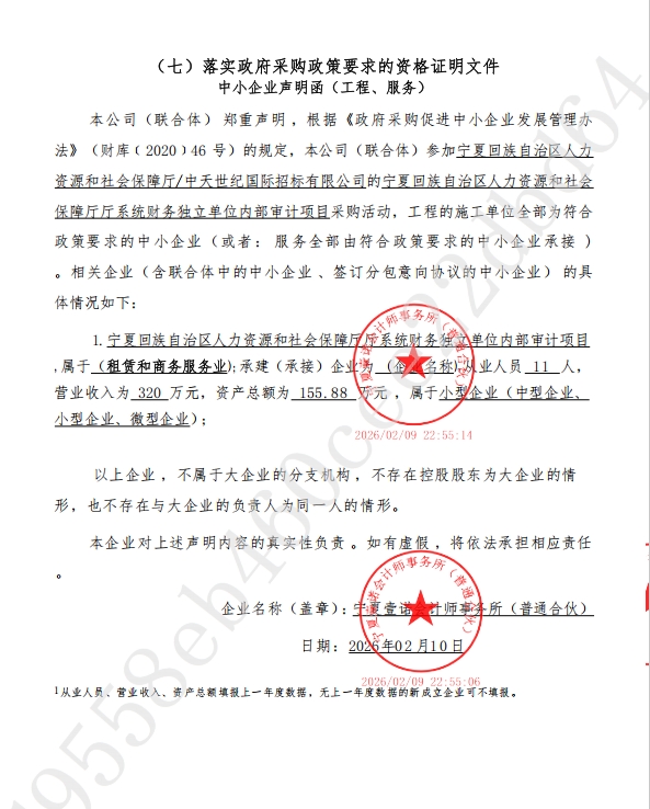 宁夏回族自治区人力资源和社会保障厅厅系统财务独立单位内部审计项目成交公告一、项目编号:ZTSJ-NZC-A26007二、项目名称:宁夏回族自治区人力资源和社会保障厅厅系统财务独立单位内部审计项目三、中标(成交)信息供应商名称供应商地址供应商联系电话中标(成交)金额(元)宁夏壹诺会计师事务所(普通合伙)贺兰县德胜商住区虹桥南街以西陕商大厦A座商办综合楼25021389520896075600.00四、主要标的信息服务类标的名称服务范围服务要求服务时间服务标准宁夏回族自治区人力资源和社会保障厅厅系统财务独立单位内部审计项目具体服务内容及要求详见磋商文件响应磋商文件要求自合同签订后2个月内完成响应磋商文件要求五、评审专家名单:吕晓燕(组长) 、胡瑞生采购人代表:牛春六、 代理服务收费标准及金额:1134.00元,收费标准按中标金额的1.5%计取,由中标人支付。七、公告期限(自本公告发布之日起1个工作日):2026年2月11日八、其他补充事宜:无九、凡对本次公告内容提出询问,请按以下方式联系。1.采购人信息名称:宁夏回族自治区人力资源和社会保障厅地址:宁夏回族自治区银川市上海东路40号联系人:崔静联系方式:0951-50991962.采购代理机构信息名称:中天世纪国际招标有限公司项目负责人:卜乐地址:银川市金凤区新昌西路金钻名座财富中心13层联系方式:0951-5156366代理机构:中天世纪国际招标有限公司发布日期: 2026年2月10日