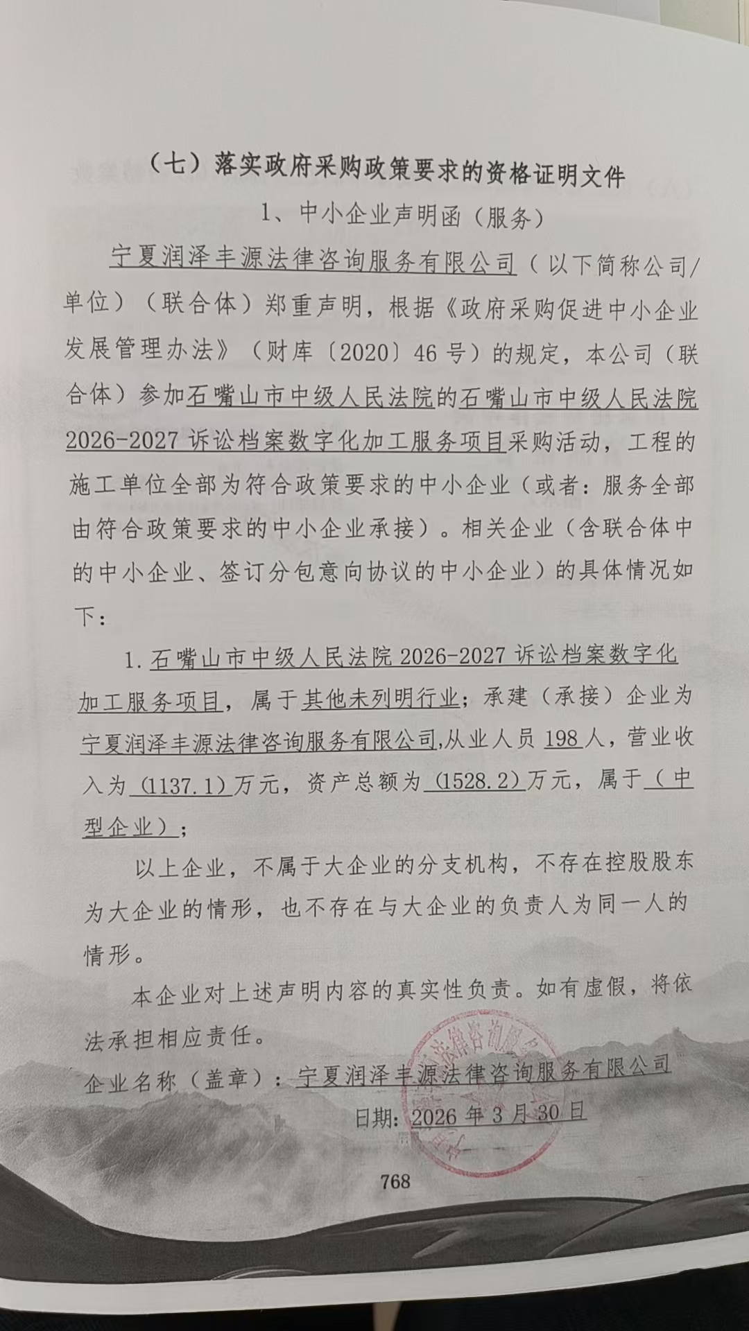 窗体顶端石嘴山市中级人民法院2026-2027诉讼档案数字化加工服务项目竞争性磋商成交公告一、项目编号:ZTSJ-NZC-S26002(招标文件编号:ZTSJ-NZC-S26002)二、项目名称:石嘴山市中级人民法院2026-2027诉讼档案数字化加工服务项目三、中标(成交)信息供应商名称:宁夏润泽丰源法律咨询服务有限公司供应商地址:宁夏银川市宁安大街490号银川IBI育成中心二期3号楼1501室中标(成交)金额:141700.00(元/年)四、主要标的信息序号供应商名称服务名称服务范围服务要求服务时间服务标准1宁夏润泽丰源法律咨询服务有限公司诉讼档案数字化加工服务具体内容详见采购文件具体内容详见采购文件2年具体内容详见采购文件五、评审专家名单:李远腾、白艳丽(组长)、赵正平。六、代理服务收费标准及金额:本项目代理费收费标准:参考原国家计委计价格【2002】1980号文的计算方法收取。本项目代理费总金额:4251.00元(人民币)七、公告期限自本公告发布之日起1个工作日。八、其它补充事宜:无九、凡对本次公告内容提出询问,请按以下方式联系。1.采购人信息名 称:石嘴山市中级人民法院地址:大武口区五岳路与星光大道交叉口西北600米联系方式:李远腾 0952-20306852.采购代理机构信息名 称:中天世纪国际招标有限公司地 址:石嘴山市大武口区永康南路 493 号联系方式:张强 130079640863.项目联系方式项目联系人:张强电 话: 13007964086中天世纪国际招标有限公司2026年03月30日